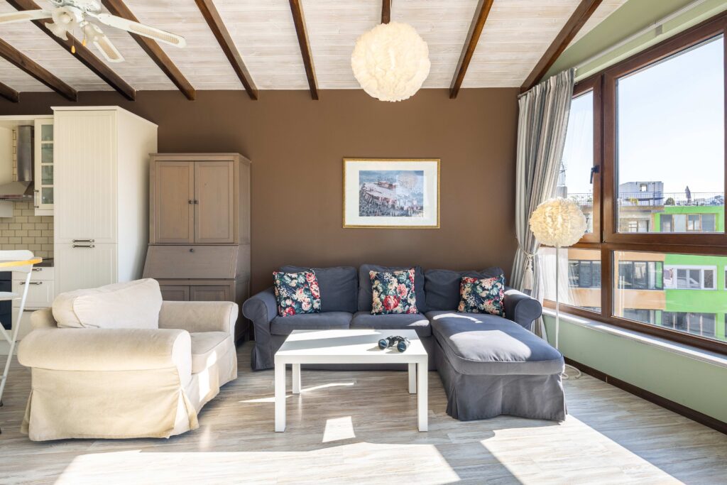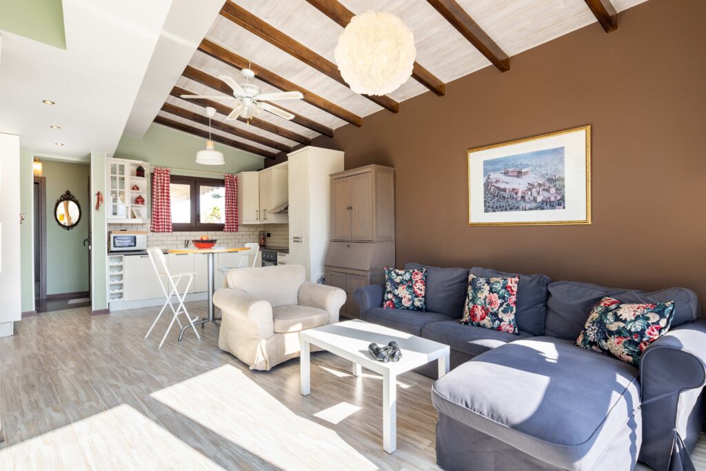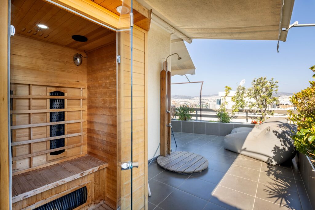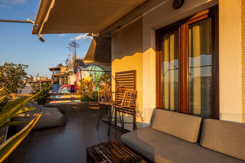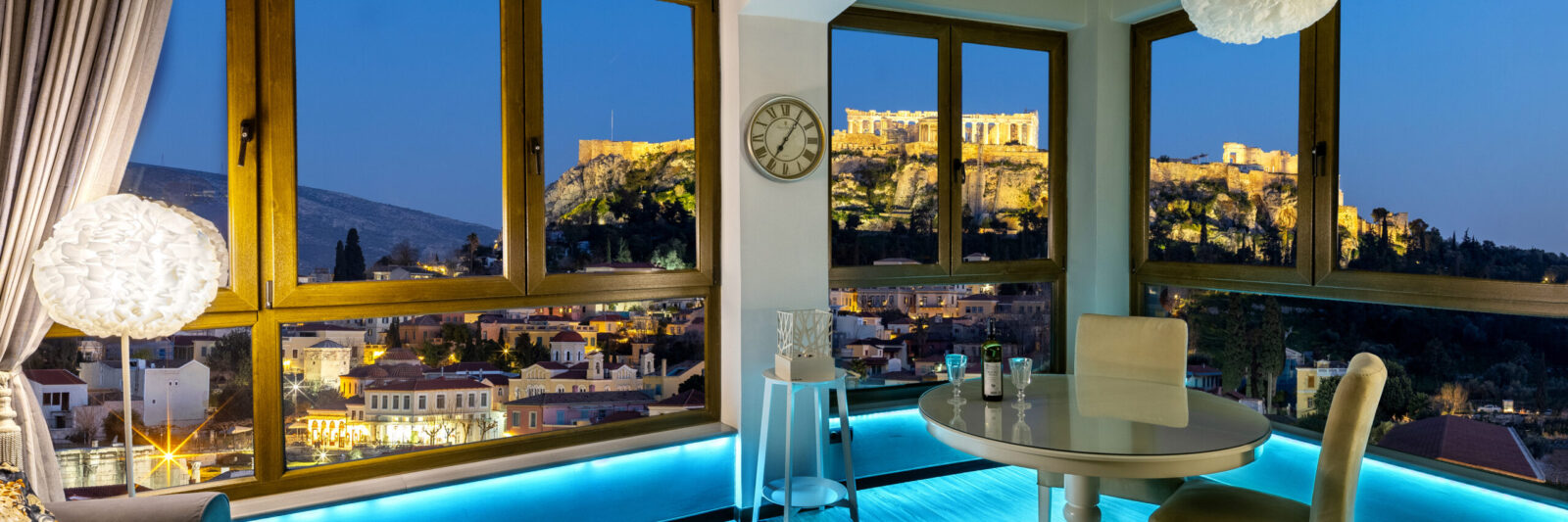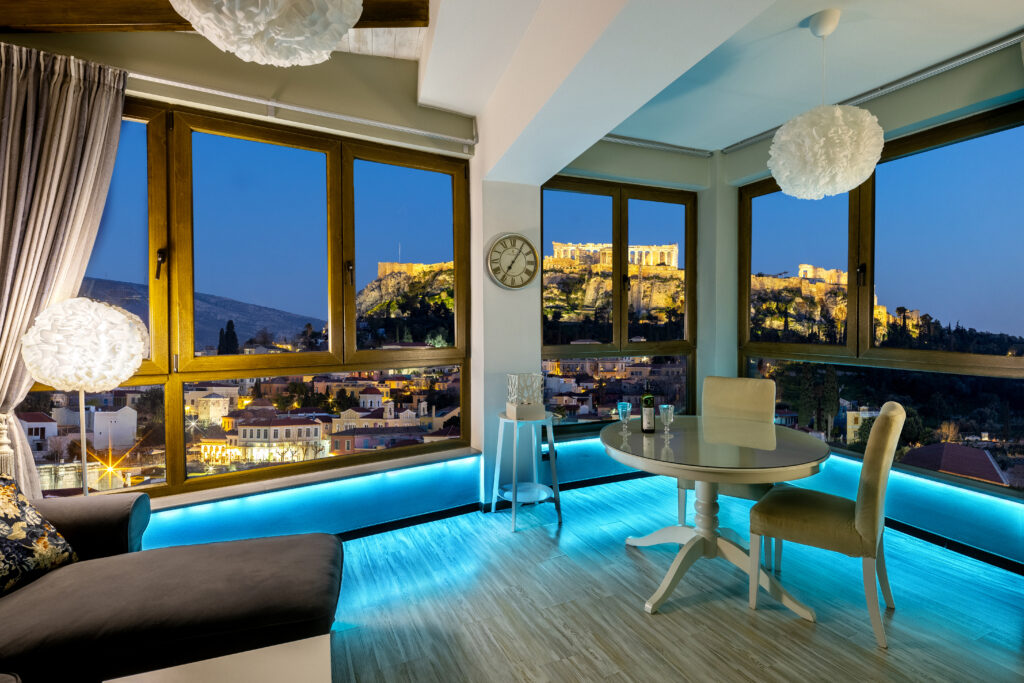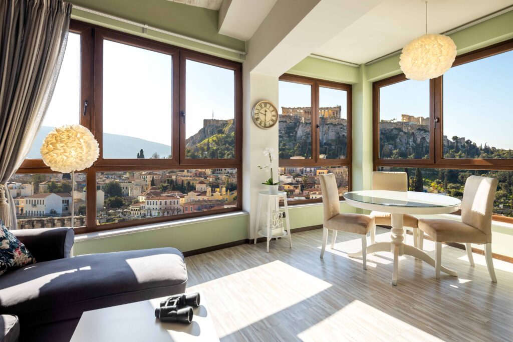 This luxurious property is privileged with a stunning Acropolis view through the floor-to-ceiling living room’s windows and it is designed with a spacious living area with a fully functional open kitchen and a dining table, a comfortable bedroom, an elegant bathroom and opens onto a fully furnished terrace surrounded by greenery, ideal for al fresco dining.